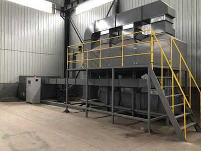 廢氣催化燃燒設(shè)備脫附后的氣體經(jīng)阻火器、進(jìn)氣閥、換熱器、電加熱器(預(yù)熱器)升溫,使氣體溫度升至催化燃燒所需要的溫度,在催化床內(nèi)的催化劑的作用下分解成水和二氧化碳,同時放出大量的熱,使氣體溫度進(jìn)一步提高,高溫氣體再通過換熱器進(jìn)行部分熱量回收后,通過風(fēng)機排出。